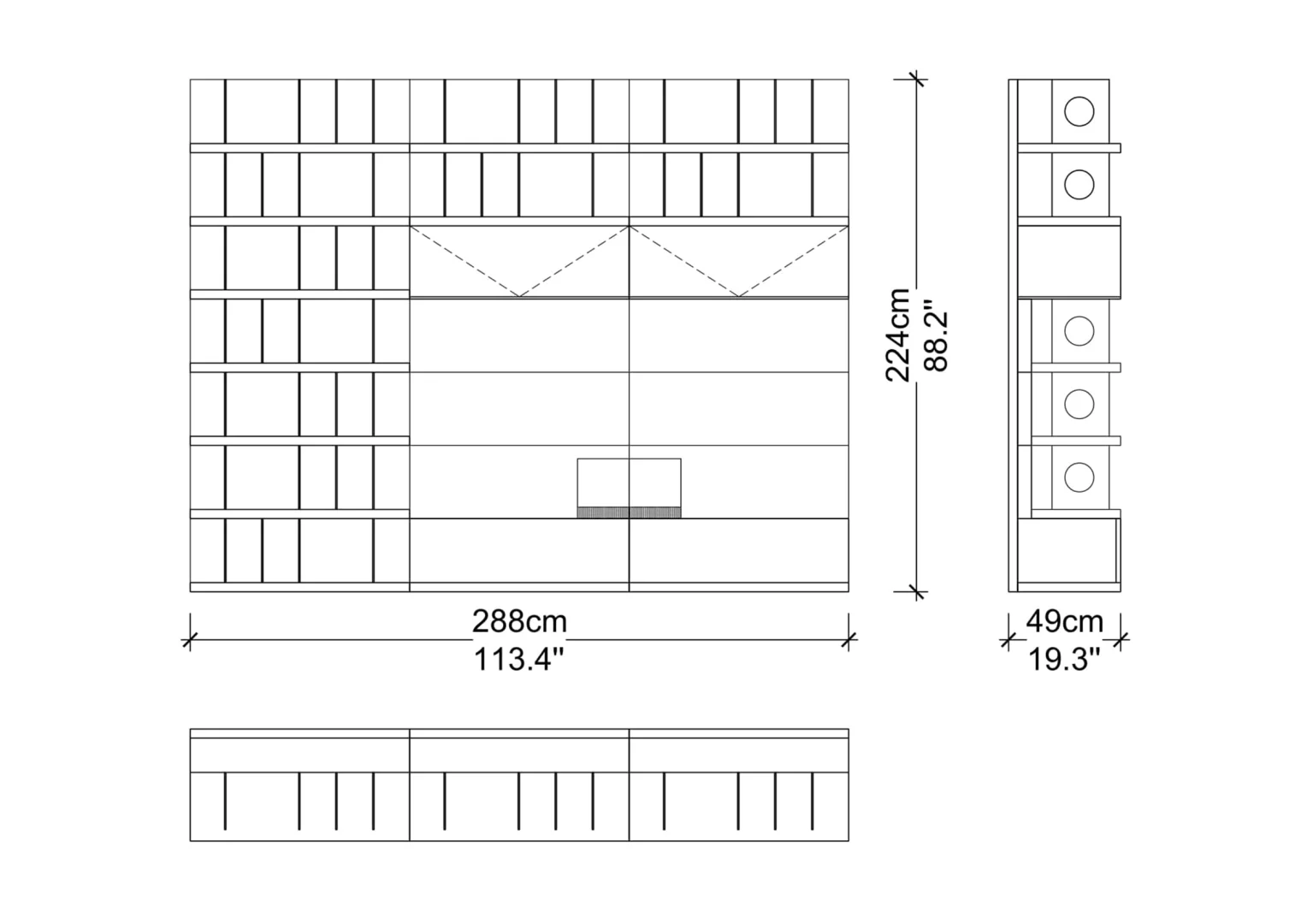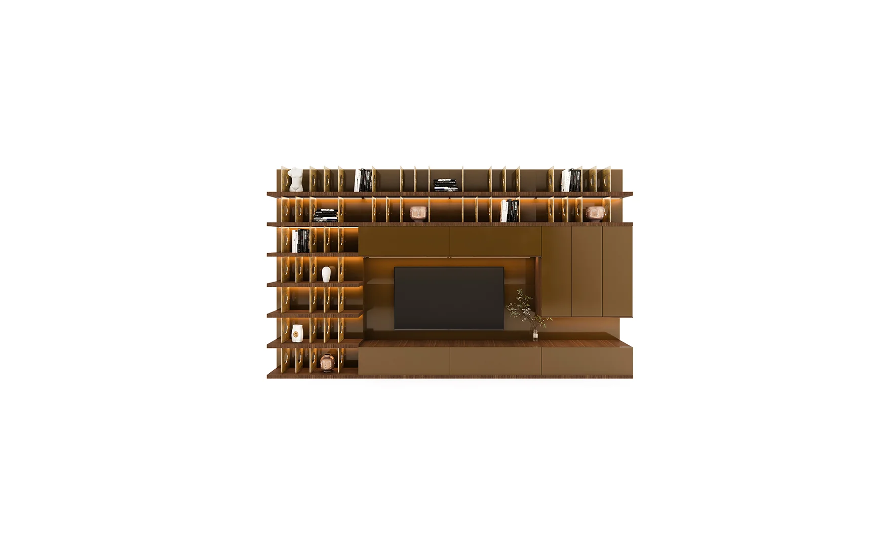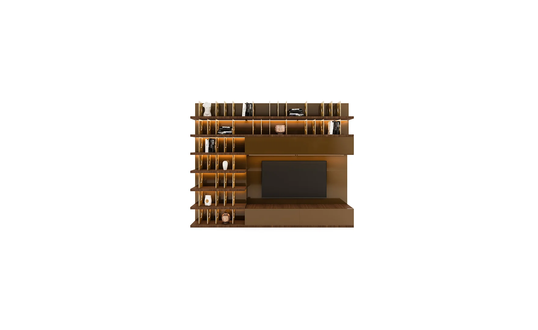 Designed with beautiful clean lines, metal details and lots of storage. It has shelving with rear outlet holes and drawers. The walnut finish was also chosen for its intricate woodgrain. The whole unit is just a marvelous piece of art.