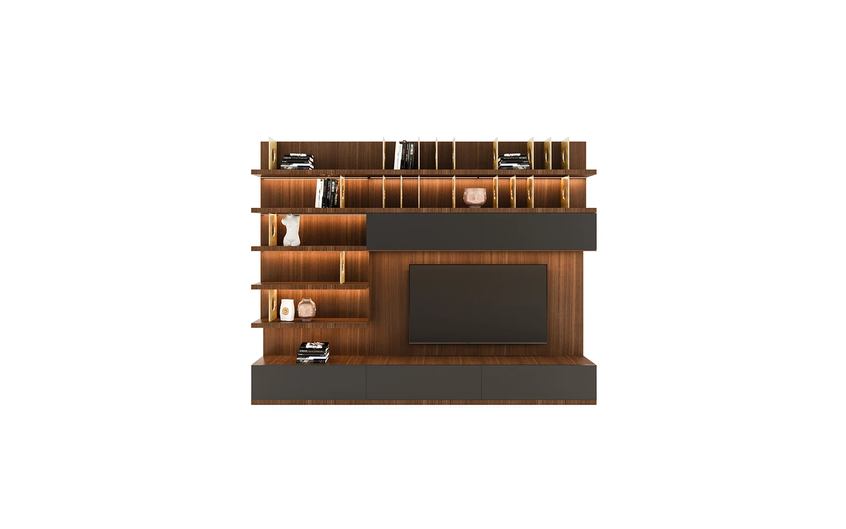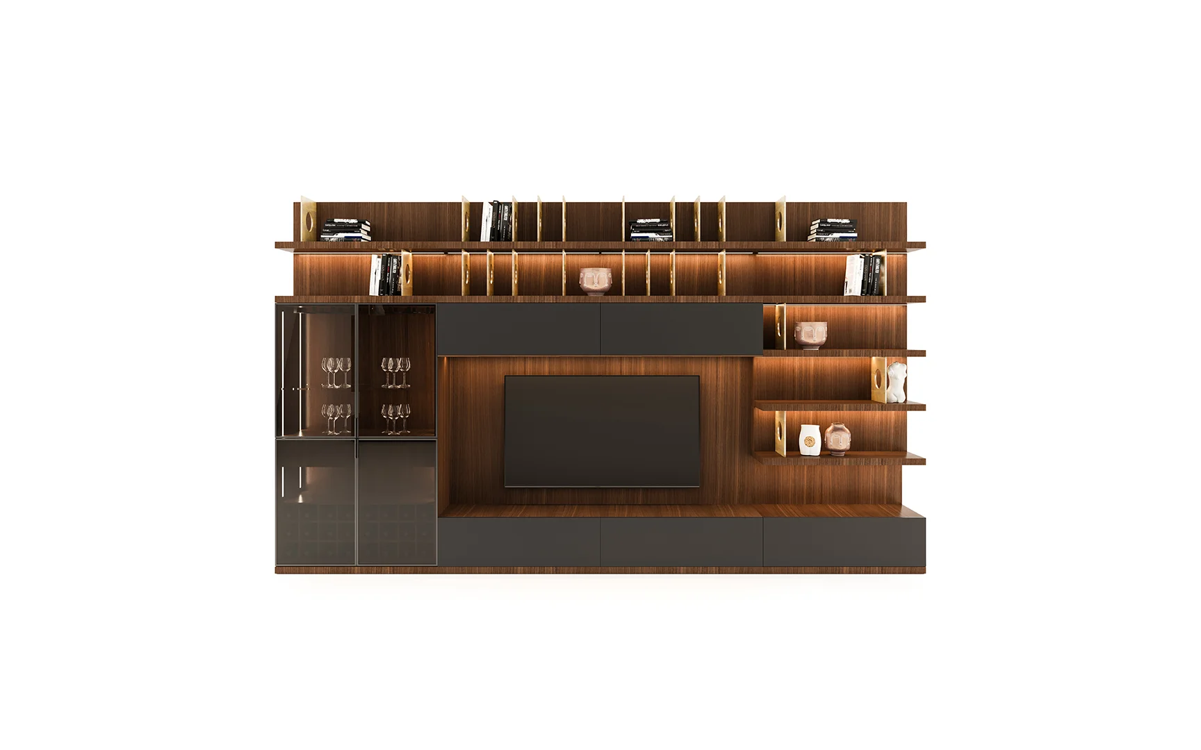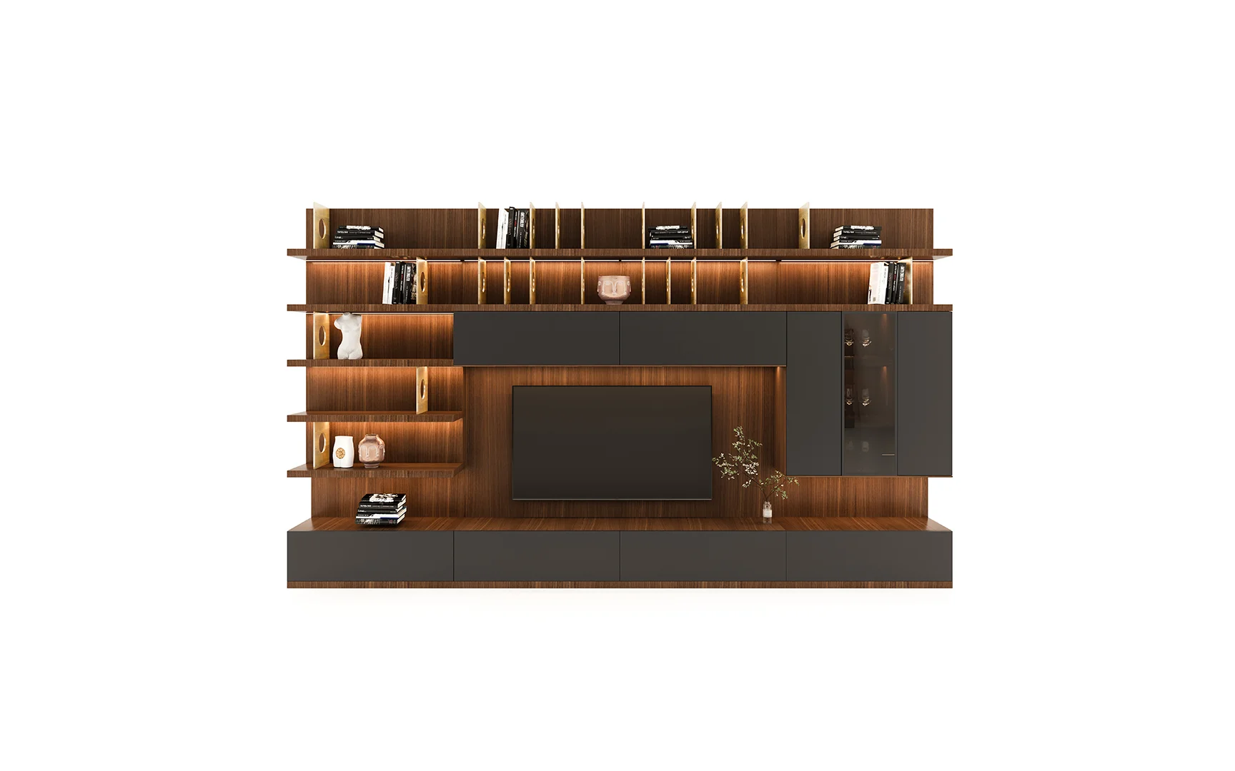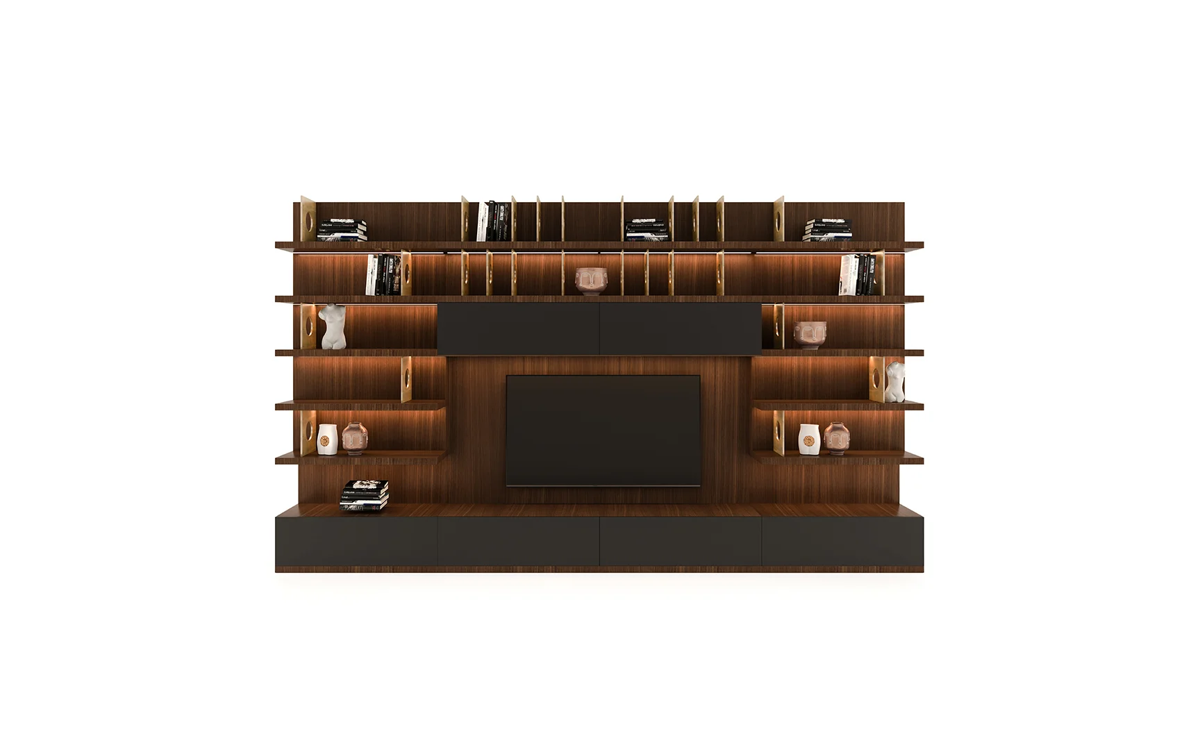 Designed with beautiful clean lines, metal details and lots of storage. It has shelving with rear outlet holes and drawers. The walnut finish was also chosen for its intricate woodgrain. The whole unit is just a marvelous piece of art.