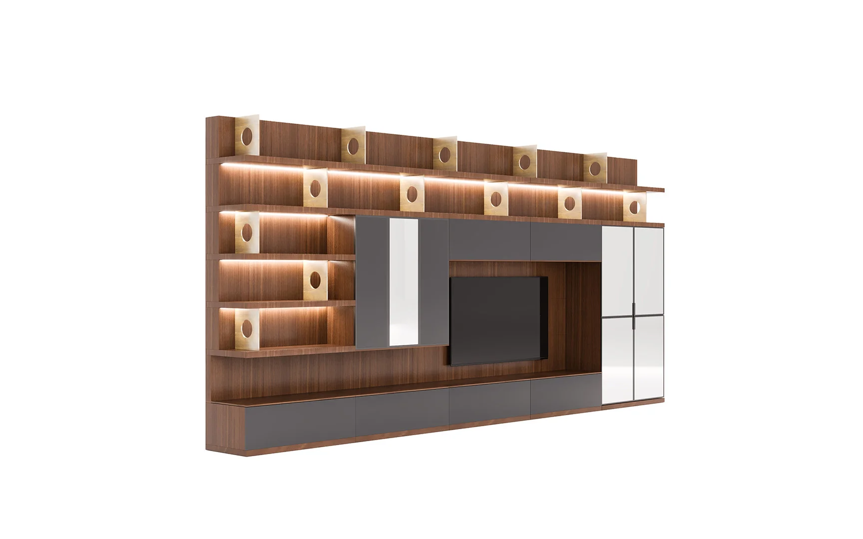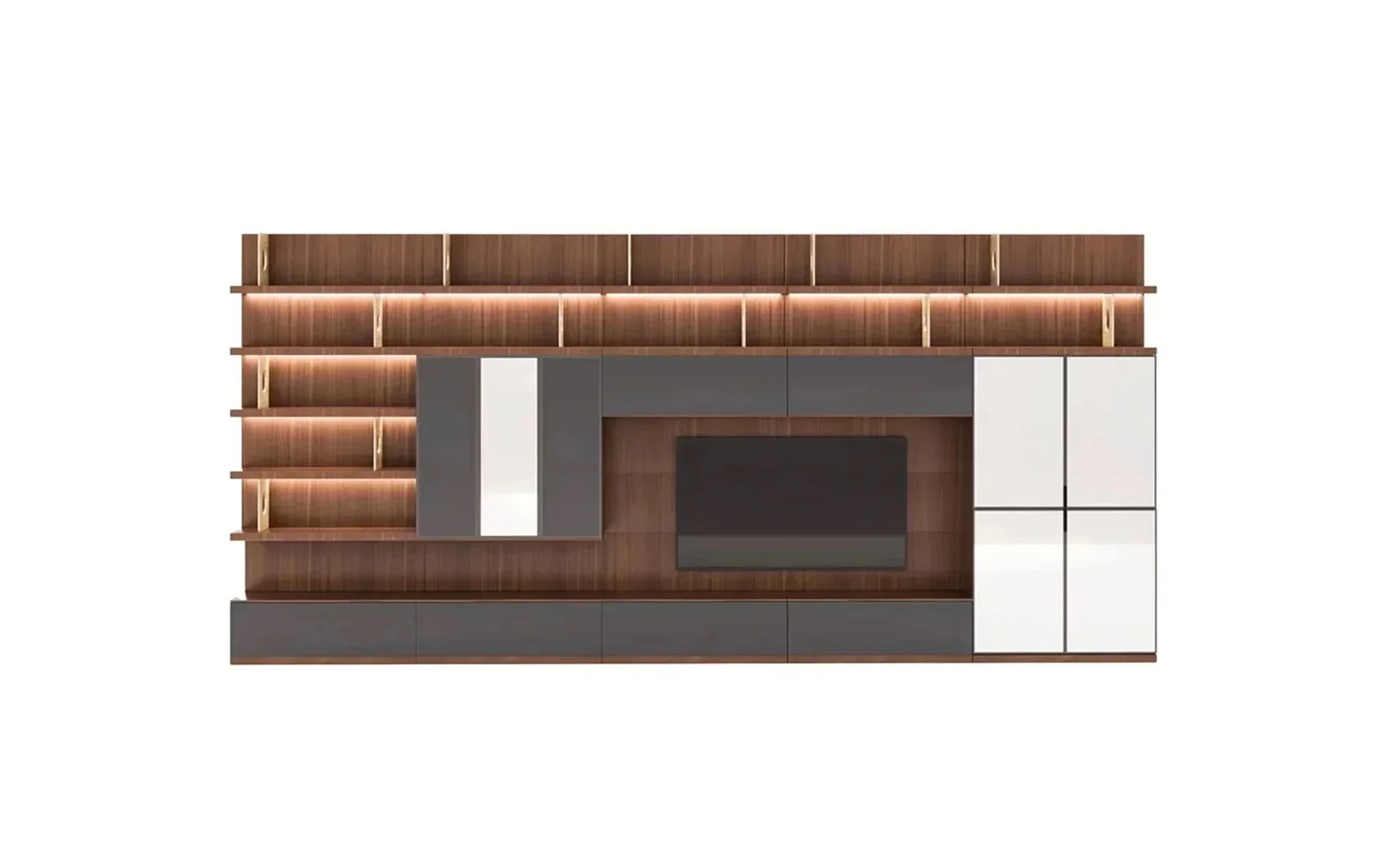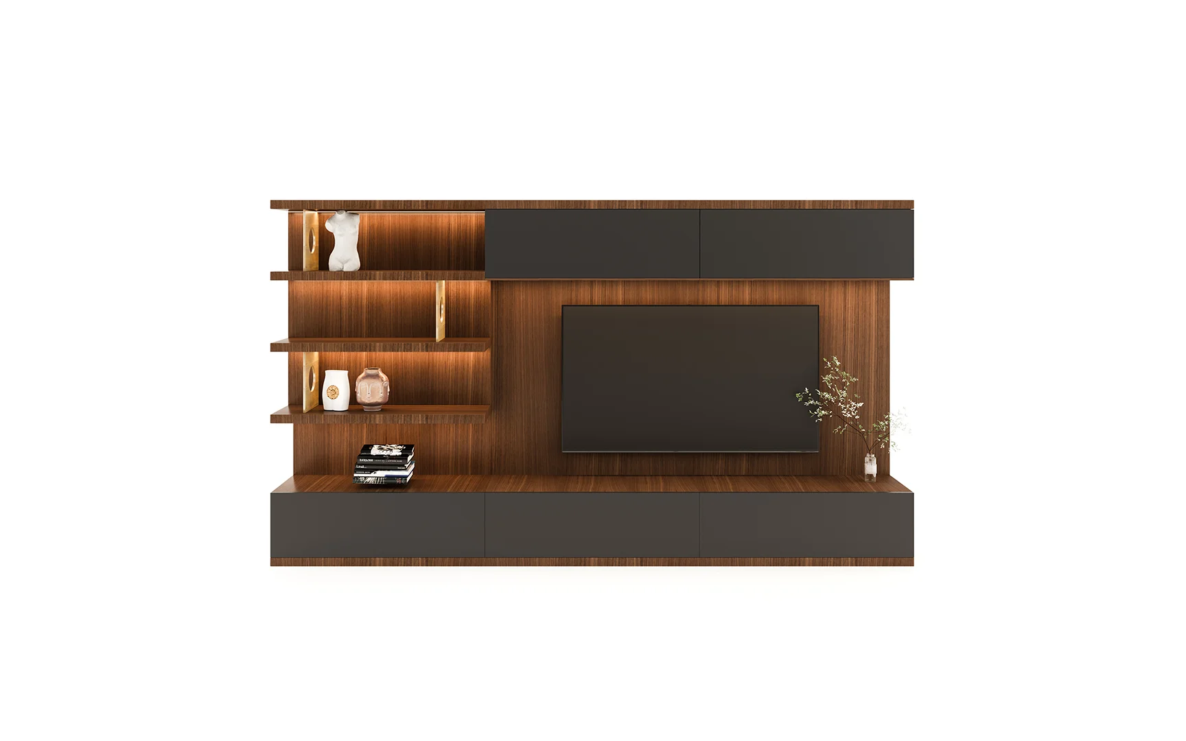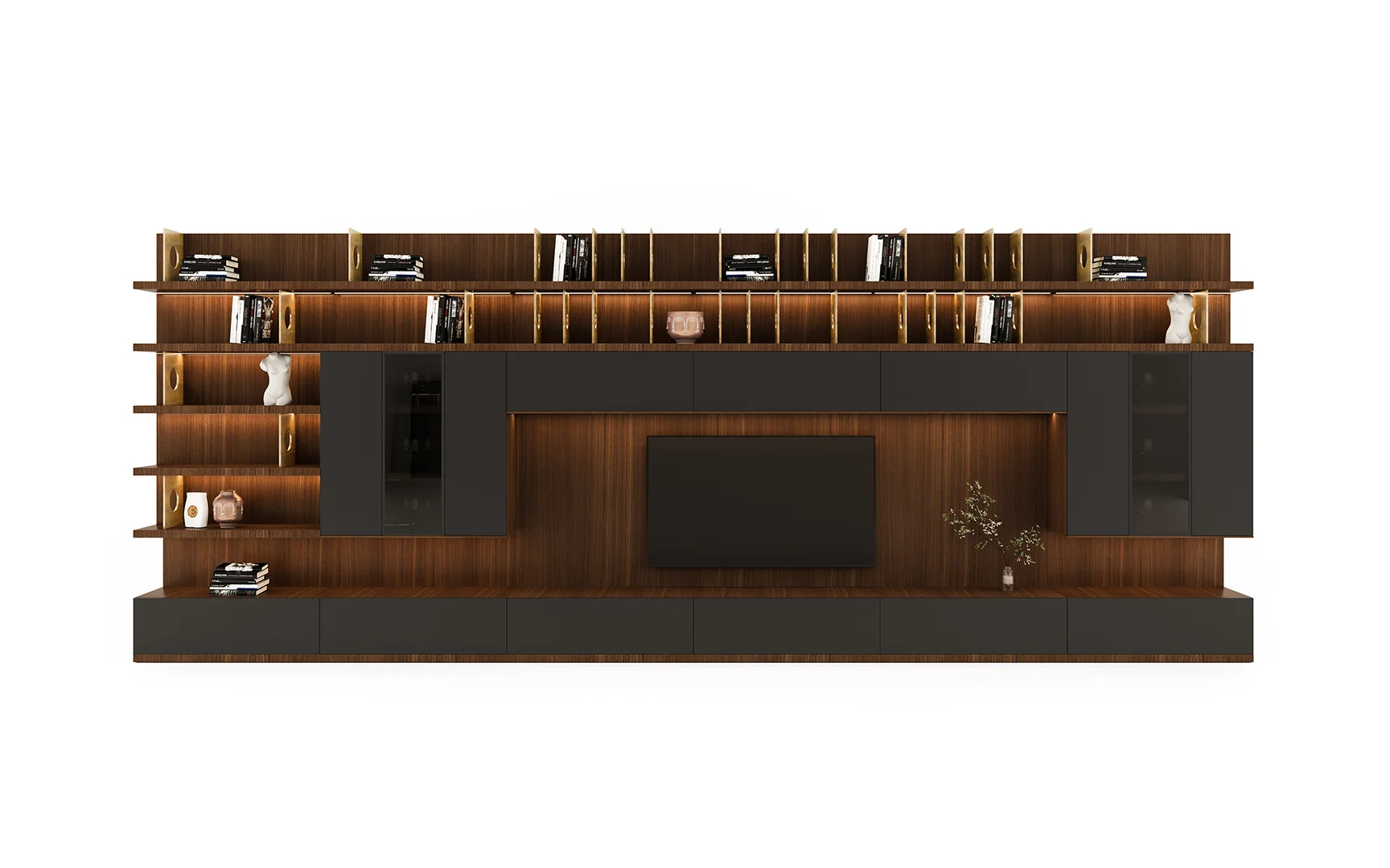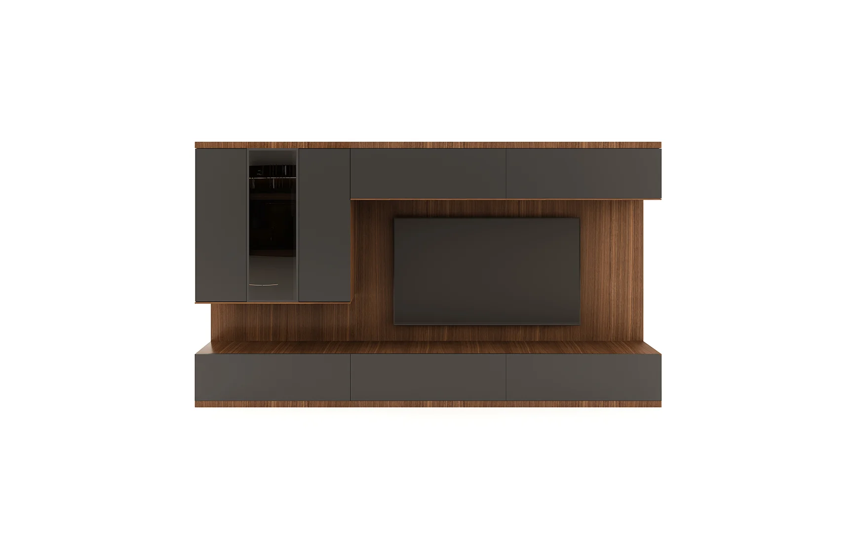 Designed with beautiful clean lines, metal details and lots of storage. It has shelving with rear outlet holes and drawers. The walnut finish was also chosen for its intricate woodgrain. The whole unit is just a marvelous piece of art.