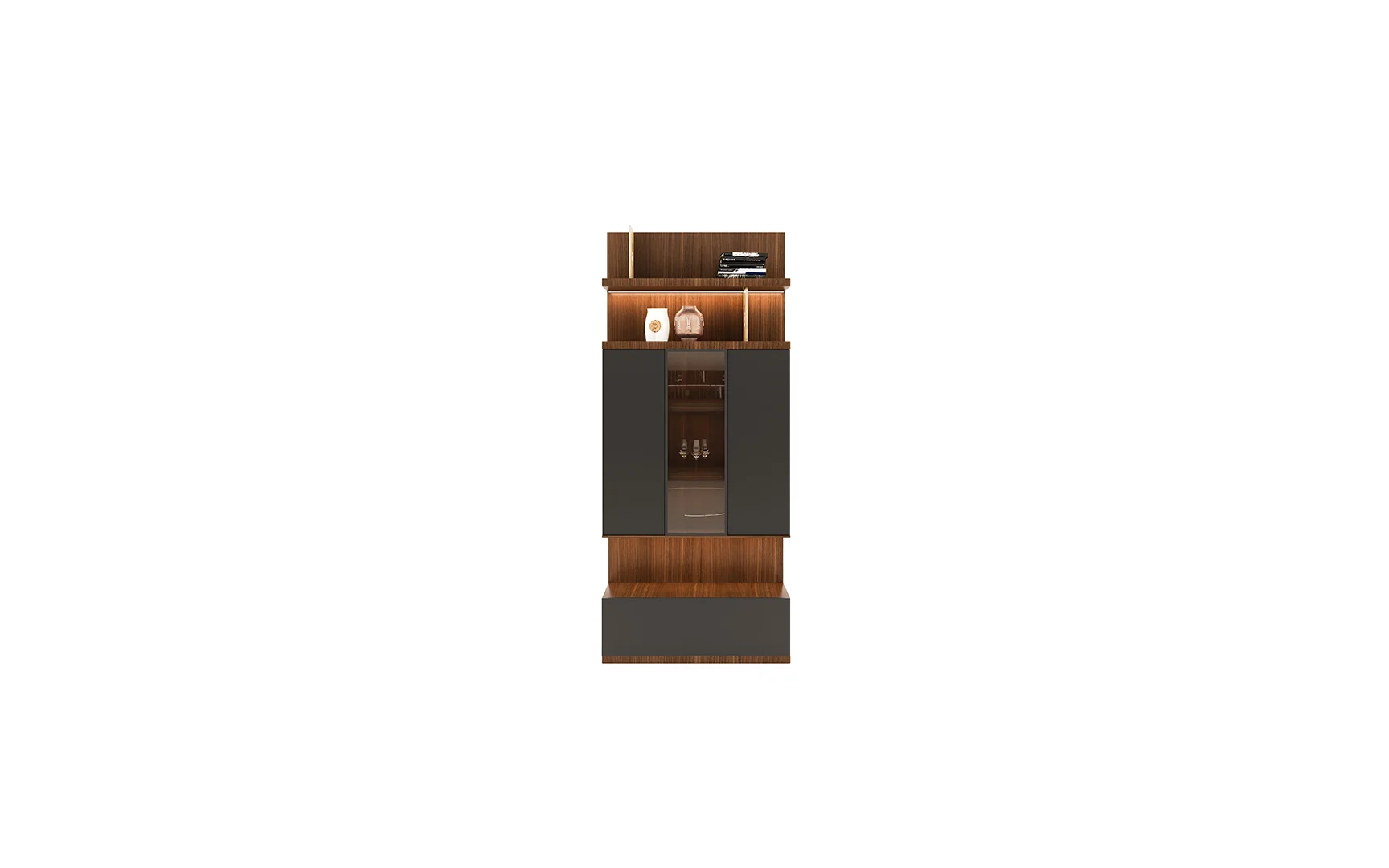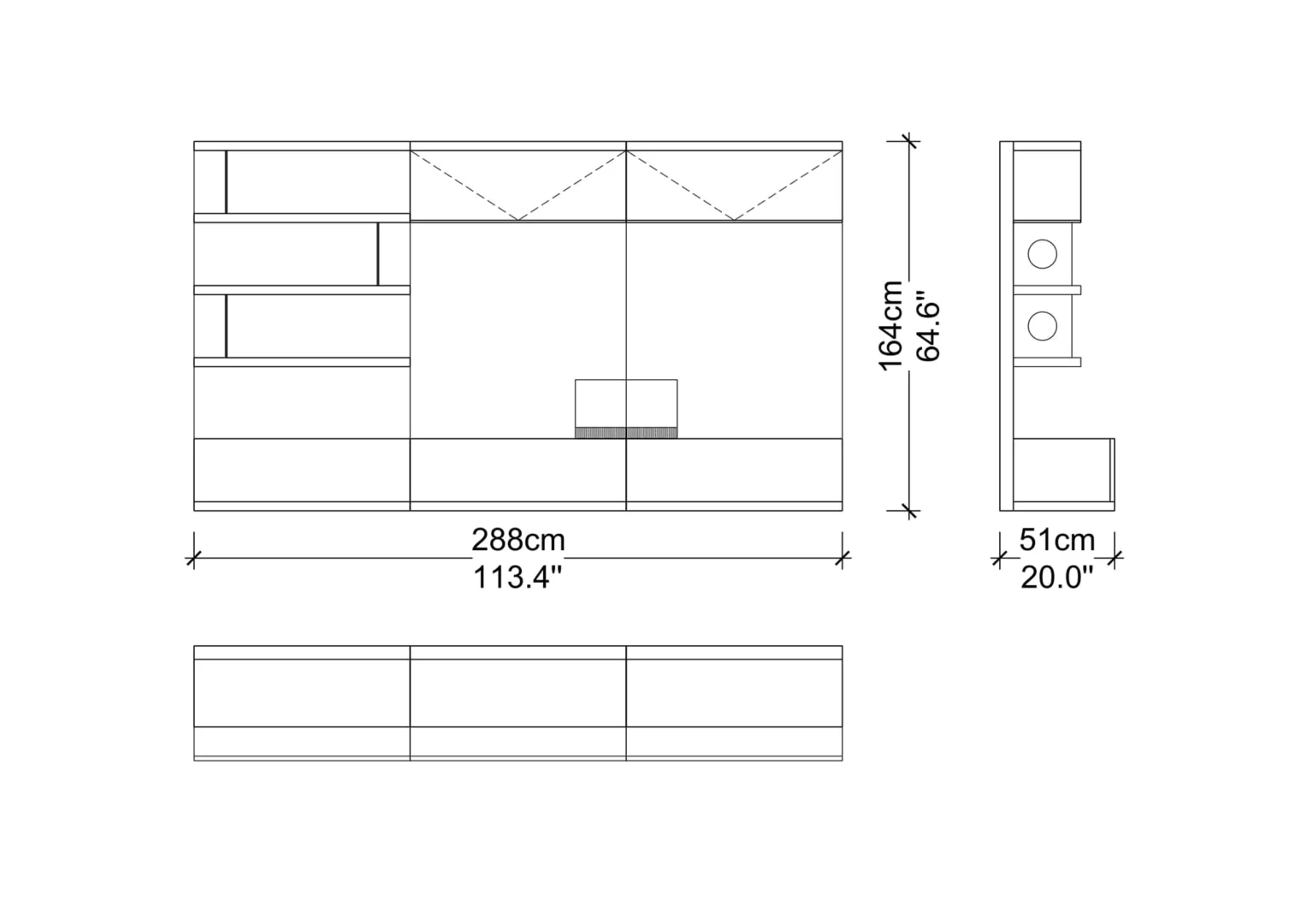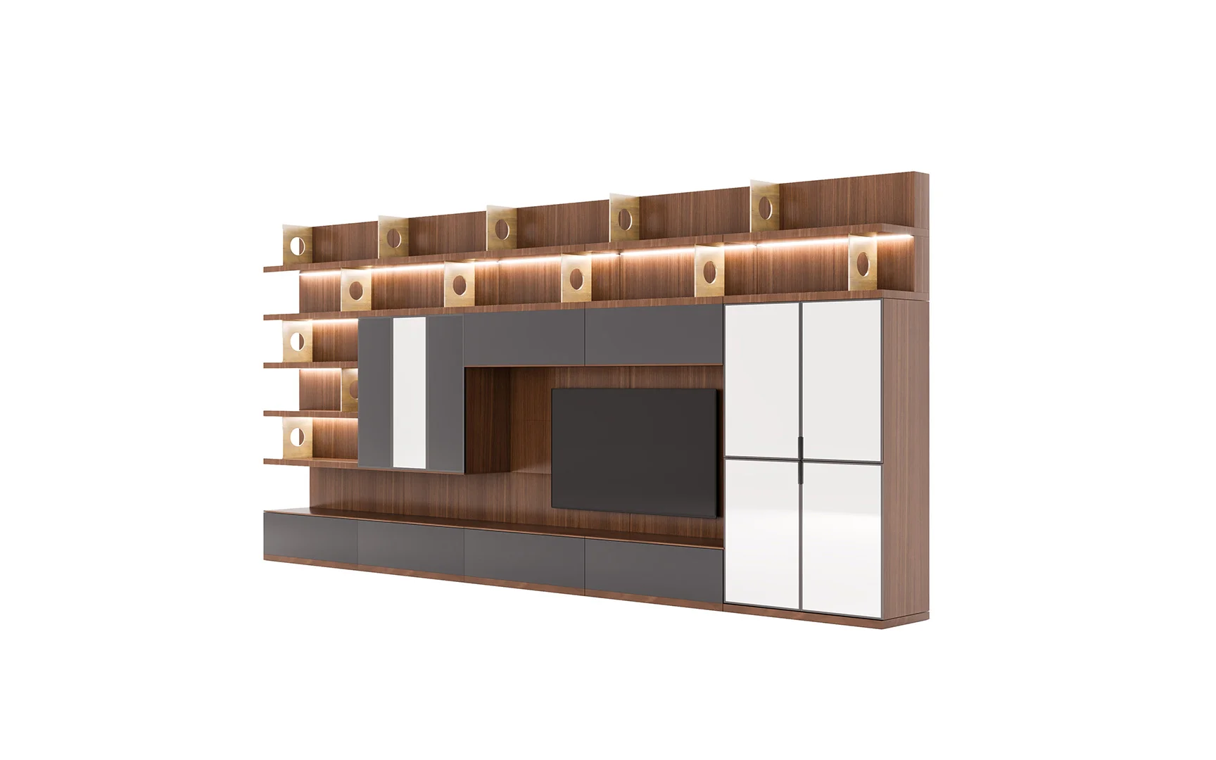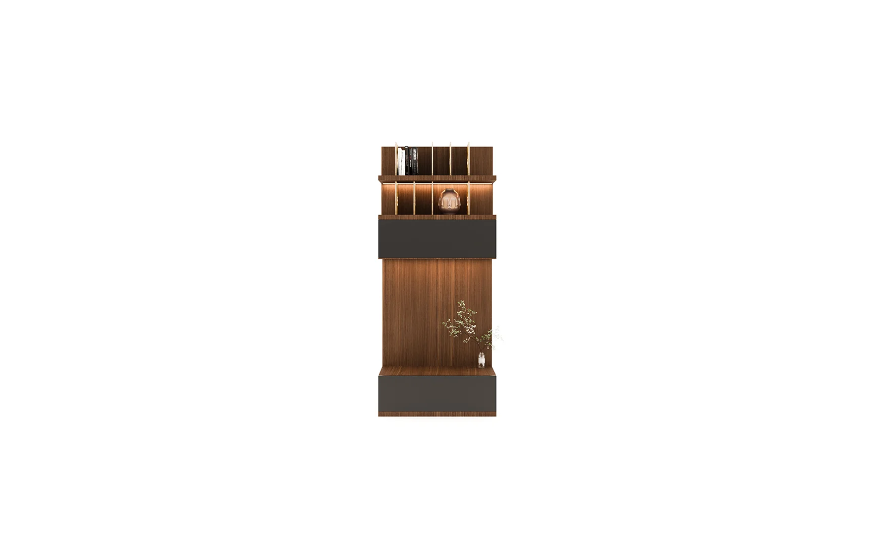 Designed with beautiful clean lines, metal details and lots of storage. It has shelving with rear outlet holes and drawers. The walnut finish was also chosen for its intricate woodgrain. The whole unit is just a marvelous piece of art.
