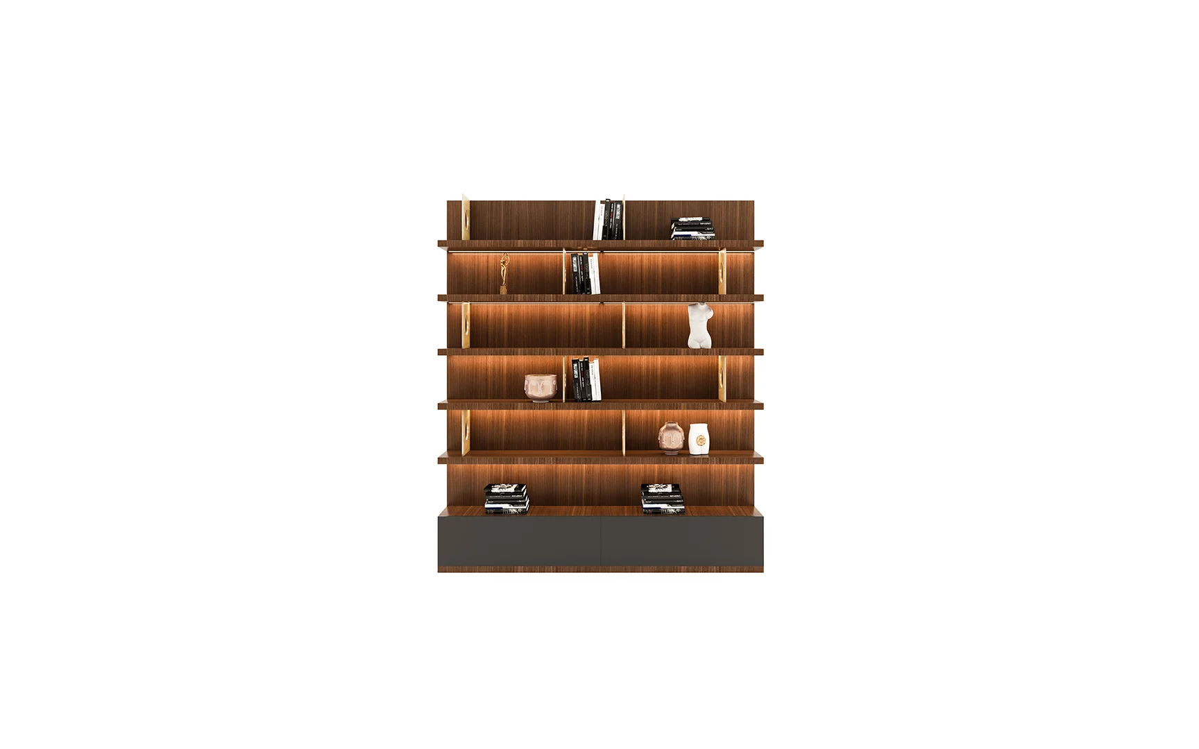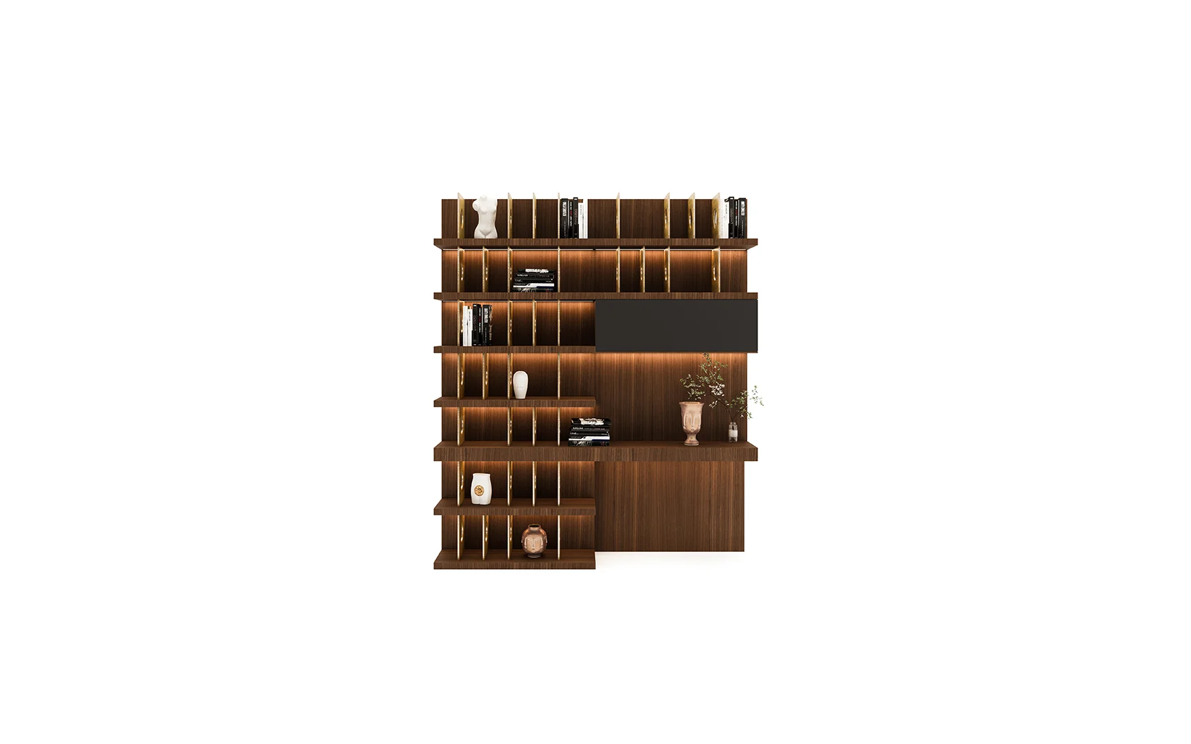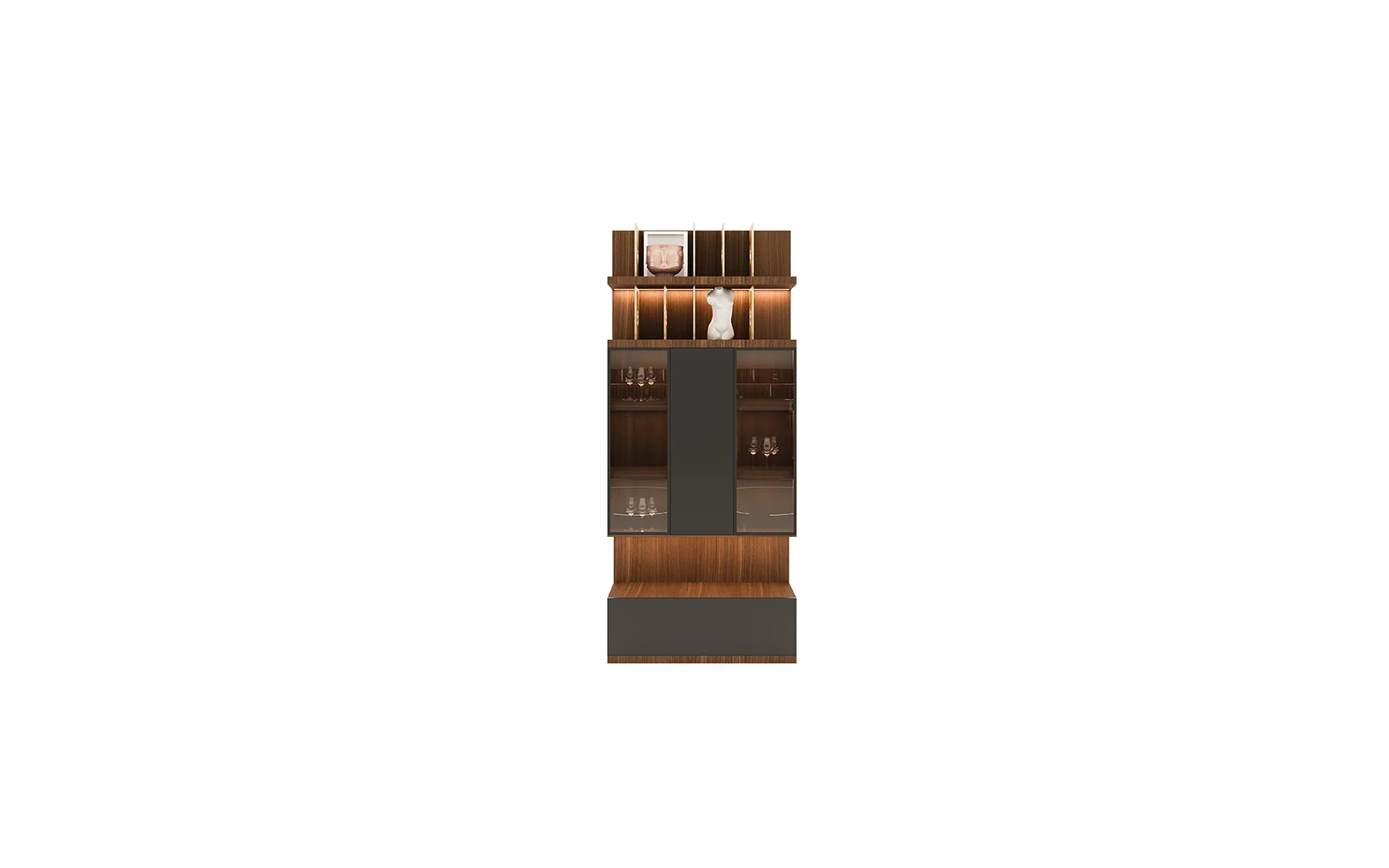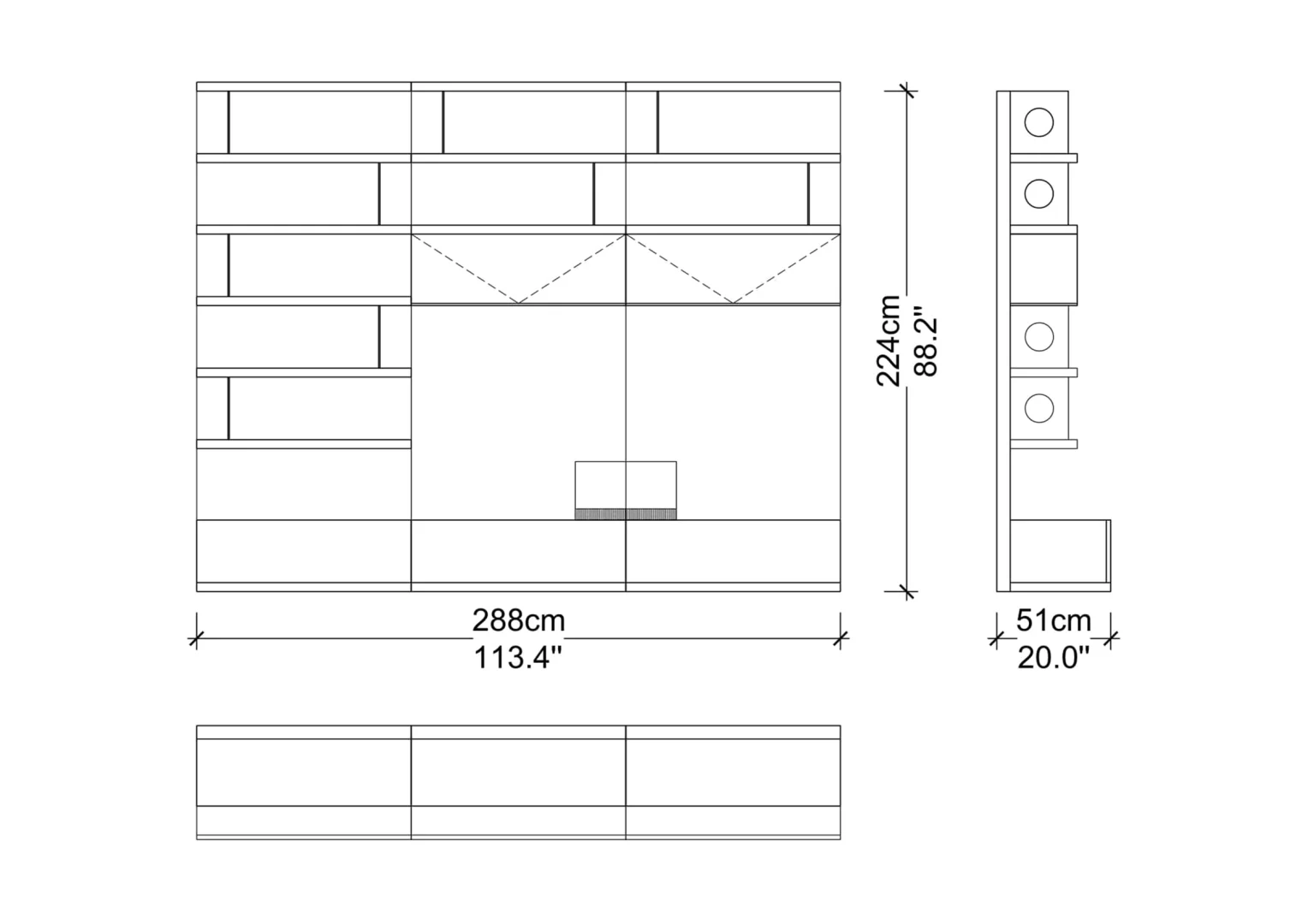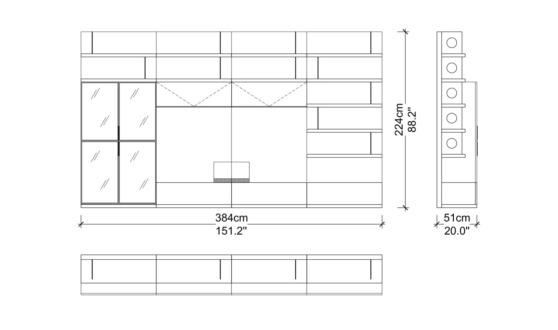 Designed with beautiful clean lines, metal details and lots of storage. It has shelving with rear outlet holes and drawers. The walnut finish was also chosen for its intricate woodgrain. The whole unit is just a marvelous piece of art.