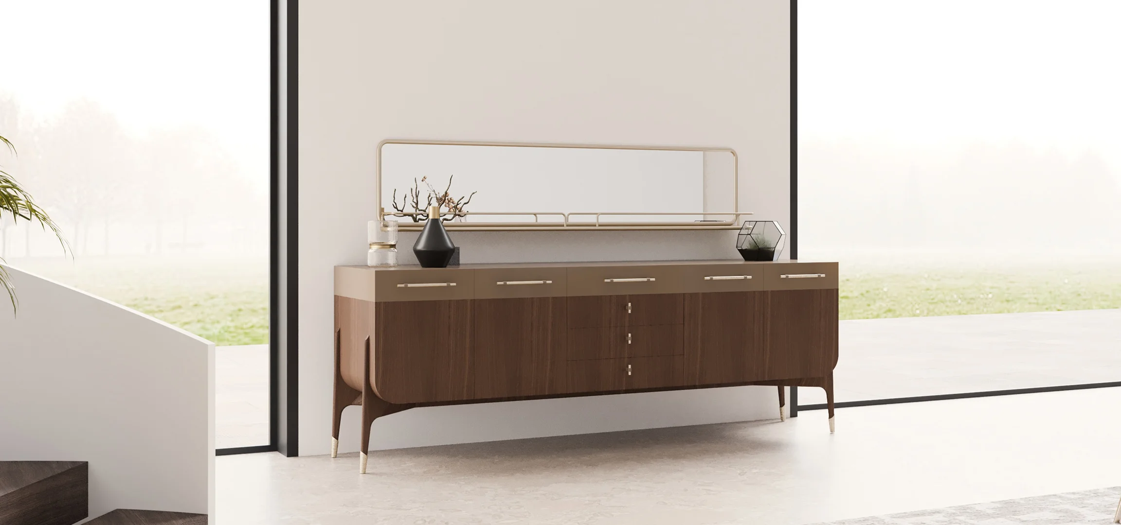 КОНСОЛЬ CAPELLA, СОЧЕТАЮЩАЯ ЭЛЕГАНТНУЮ ТЕКСТУРУ ДЕРЕВА С СОВРЕМЕННЫМИ ЛИНИЯМИ, СИНТЕЗИРУЕТ ЭСТЕТИКУ С ЕЕ ДЕТАЛЯМИ И ВЫДВИЖНЫМИ ЯЩИКАМИ.