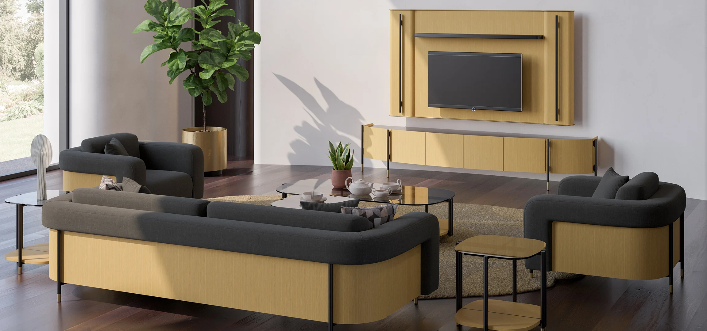 Vega TV ünitesi ana hatlarıyla mermer, metal ve ahşap malzemelerinin güçlü enerjisini oturma odasının ambiyansına dahil ediyor.